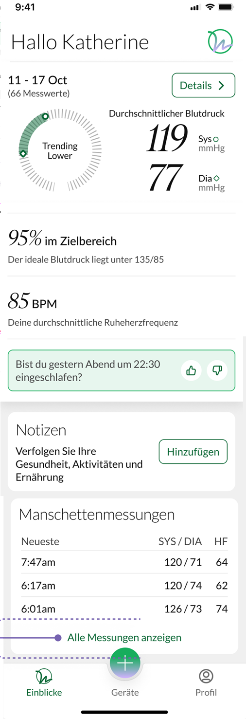 Sobald die Messung abgeschlossen ist, können Sie Ihre Sofortmessungen in "Einblicke" anzeigen und nach unten zu "Manschettenmessungen" scrollen.