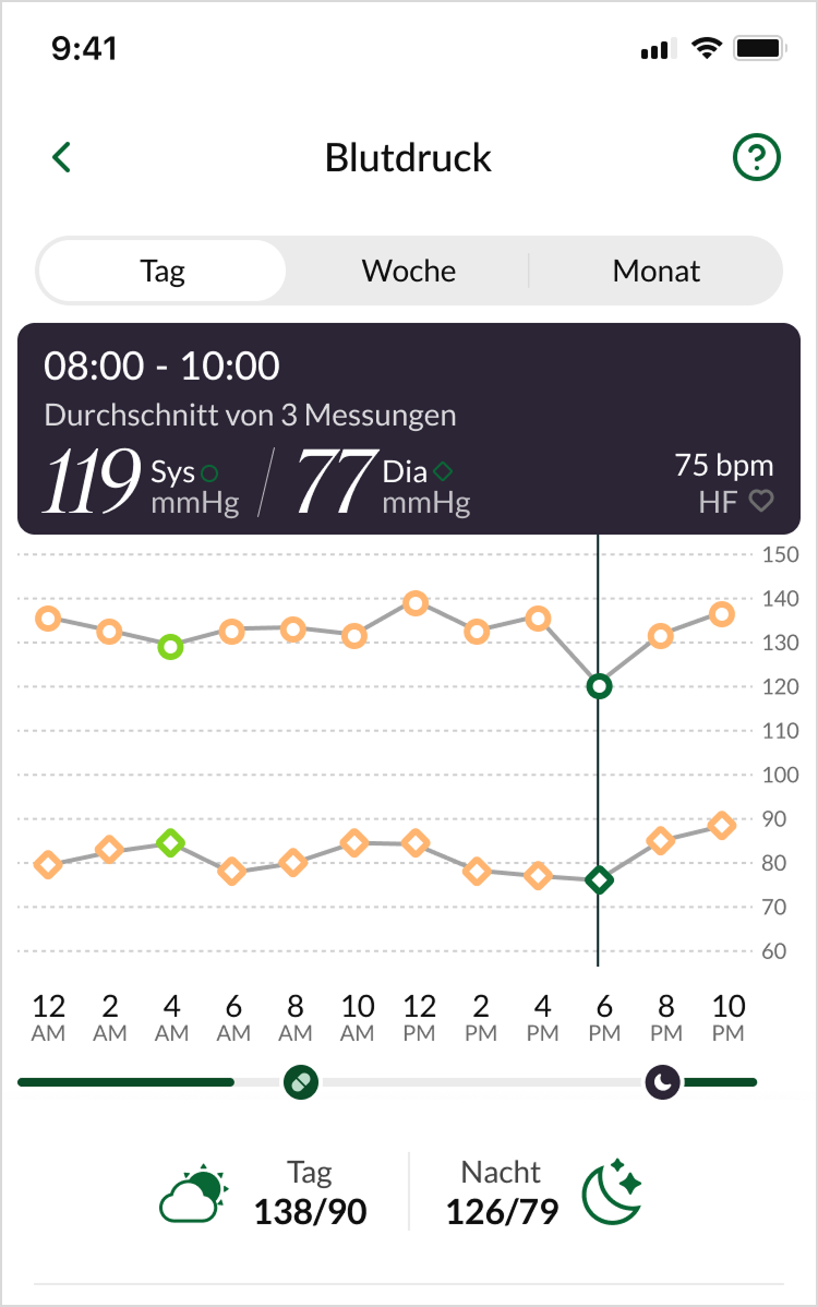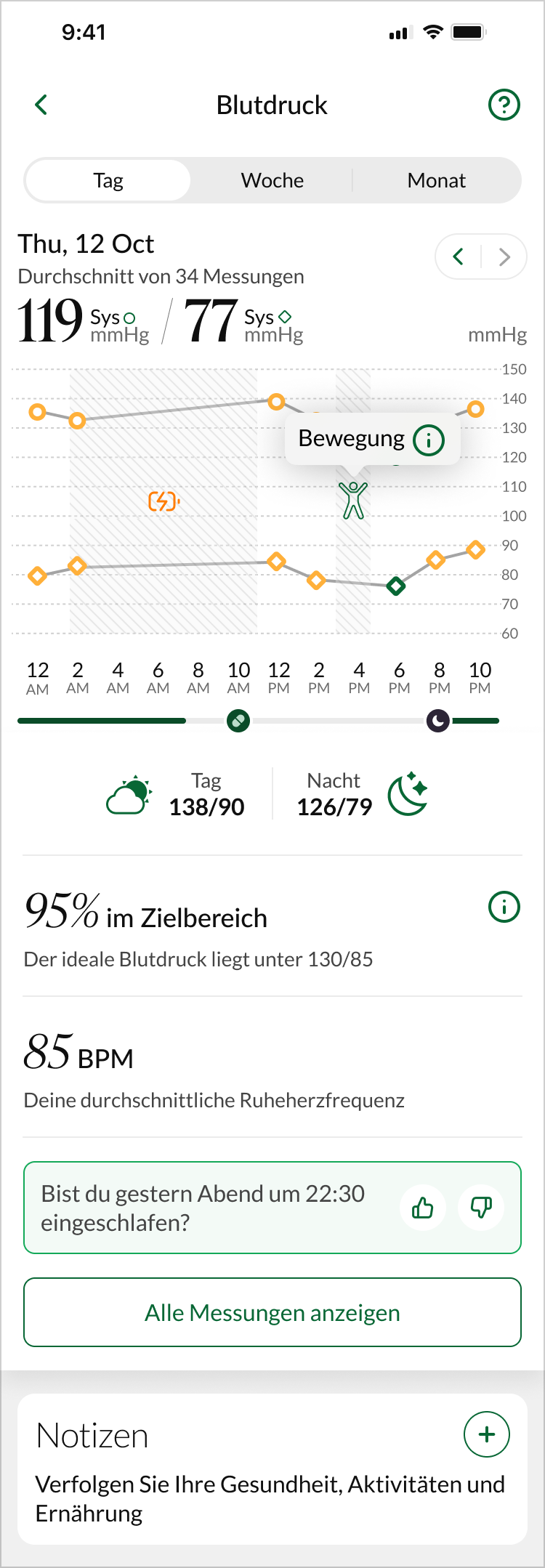 Der detaillierte Blutdruckbildschirm kann im “Einblicke”-Tab ganz einfach aufgerufen werden, indem Sie irgendwo auf die Karte „Durchschnittlicher Blutdruck“ oder auf den grünen Pfeil oben rechts auf der Karte klicken. Dies führt Sie zu einem Bildschirm, der den Durchschnitt aller Blutdruckmessungen anzeigt, die innerhalb eines 2-Stunden-Zeitraums durchgeführt wurden.