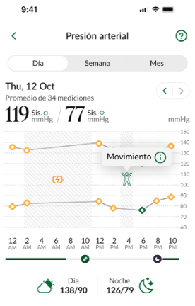 Los círculos representan la medición media de su tensión arterial sistólica en un intervalo de tiempo de 2 horas (se muestra en el eje inferior).