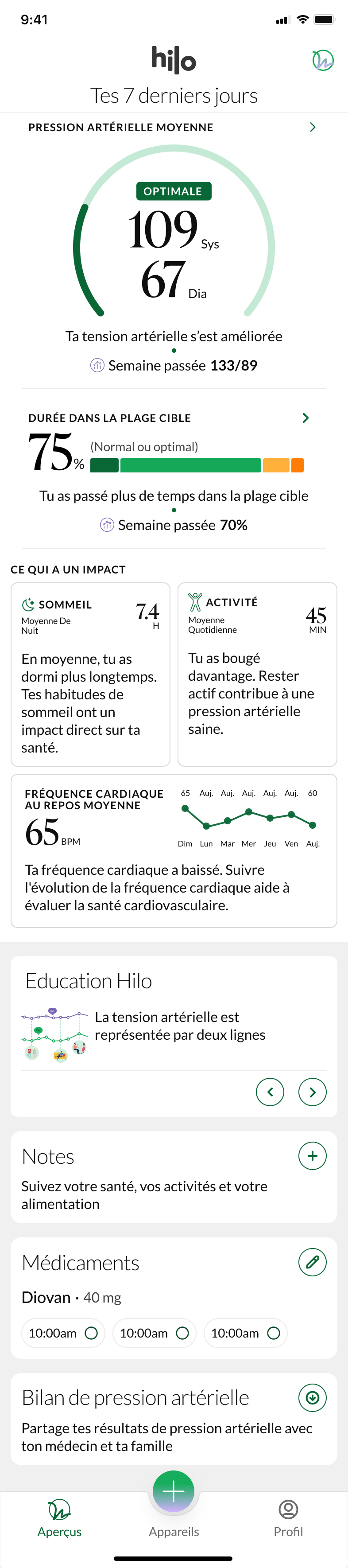 Juste sous la moyenne, comparez la moyenne des derniers 7 jours avec celle de la semaine précédente (ici, la semaine dernière était 133 / 89). Cela vous aide à suivre les améliorations ou les changements dans le temps.