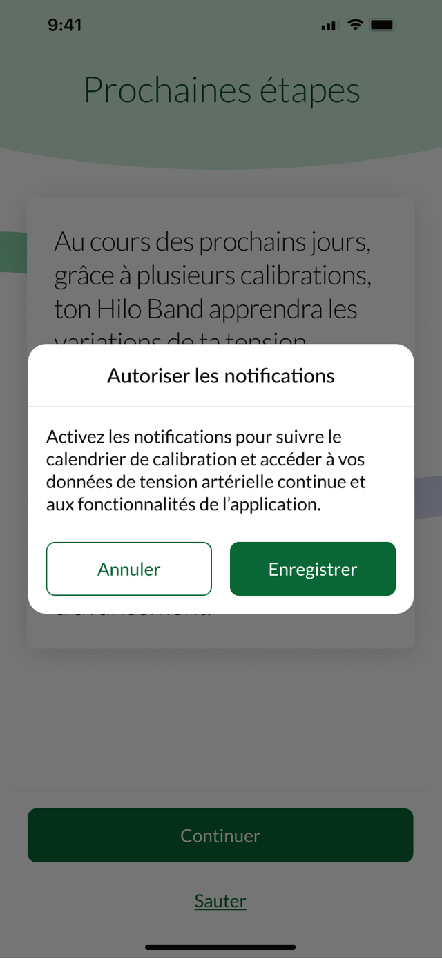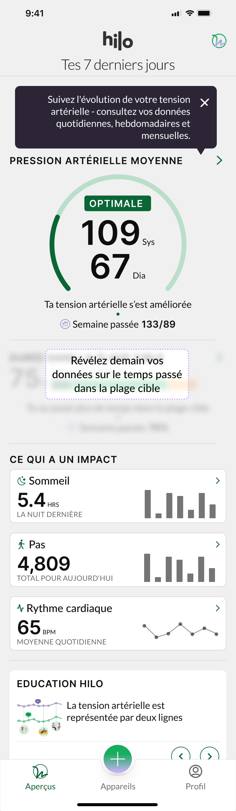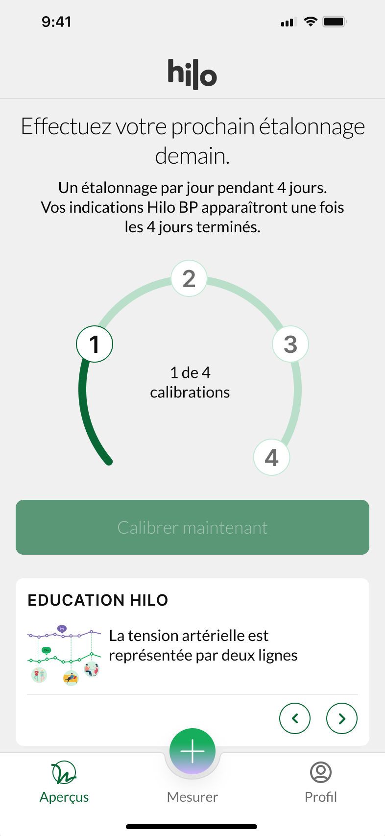 L’application Hilo n’affichera pas les données de pression artérielle tant que les quatre calibrations requises n’auront pas été réalisées avec succès. Cependant, le bracelet Hilo doit être porté en continu à partir de la première calibration. Même si aucun résultat n’est affiché pendant cette période, le bracelet continue d’enregistrer des données en arrière-plan afin d’établir votre profil personnel.