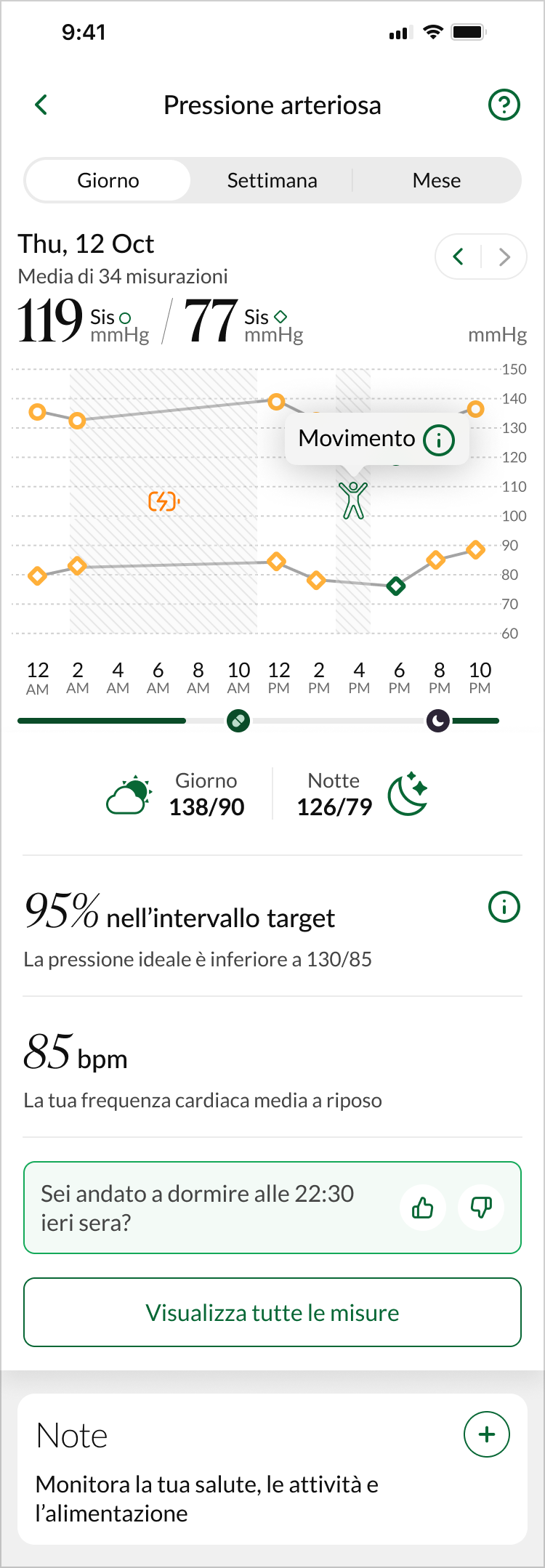 Lo schermo dettagliato della pressione sanguigna è facilmente accessibile nella scheda “Scoperte” cliccando in qualsiasi punto della scheda Pressione Arteriosa Media o sulla freccia verde in alto a destra della scheda. Questo ti porterà a uno schermo che mostra la media di tutte le misurazioni della pressione sanguigna effettuate in un intervallo di 2 ore.